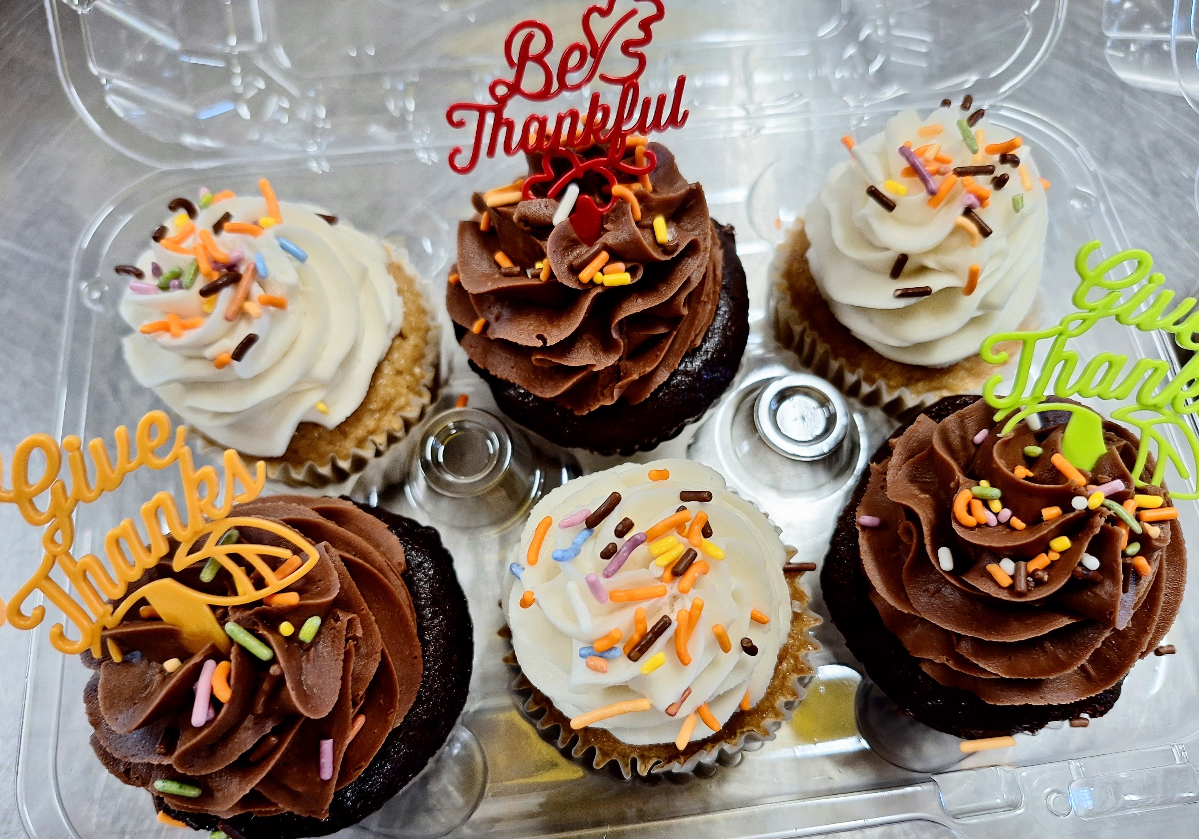 A festive 6 pack of 3 vanilla cupcakes and 3 chocolate cupcakes decorated for the season or your special occasion. Designs may vary. Our cupcakes are topped with organic frosting and decorated with plant based coloring dyes and plant based organic sprinkles. Free of gluten, dairy, soy, peanuts and GMO’s, we instead use the finest organic ingredients to produce the most satisfying dessert, so indulge without guilt!
