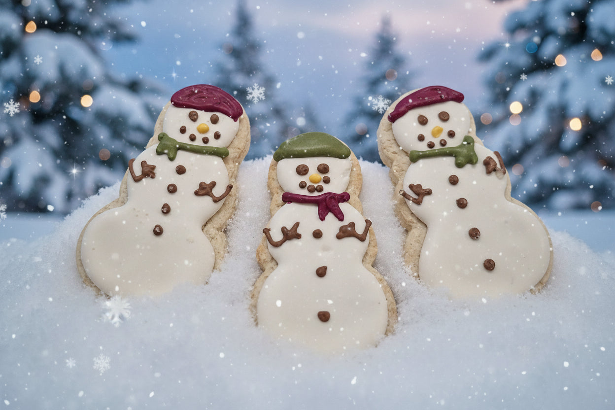 Each season, we handcraft festive designs to sweeten your day and we do it with non-GMO and organic ingredients. Celebrate Winter Fun with these festive Snowmen Shaped Sugar Cookie designs, a sure sign of the changing season. Meticulously decorated with organic plant based dyes and always gluten and dairy free.